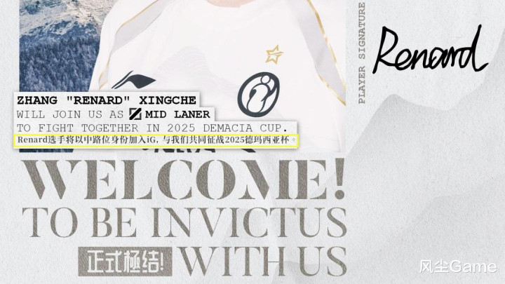 转会期关注度很高的IG,也已经发文官宣了,上单韩援Soboro,下路双人组P小将和Jwei,中单位置,签了临时工Renard,在官宣配图里,IG特意给这位小将,加了一段小字:Renard选手以中路身份加入IG,与我们共同征战德玛西亚杯,其他选手都没有强调,看来只是暂借过来打德杯。